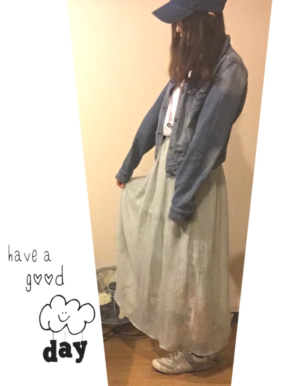デニムジャケットとデニムキャップ♪ 白Tシャツはユニクロです。 ジャケットが短めの丈なので、足長に見えるかな?(笑)