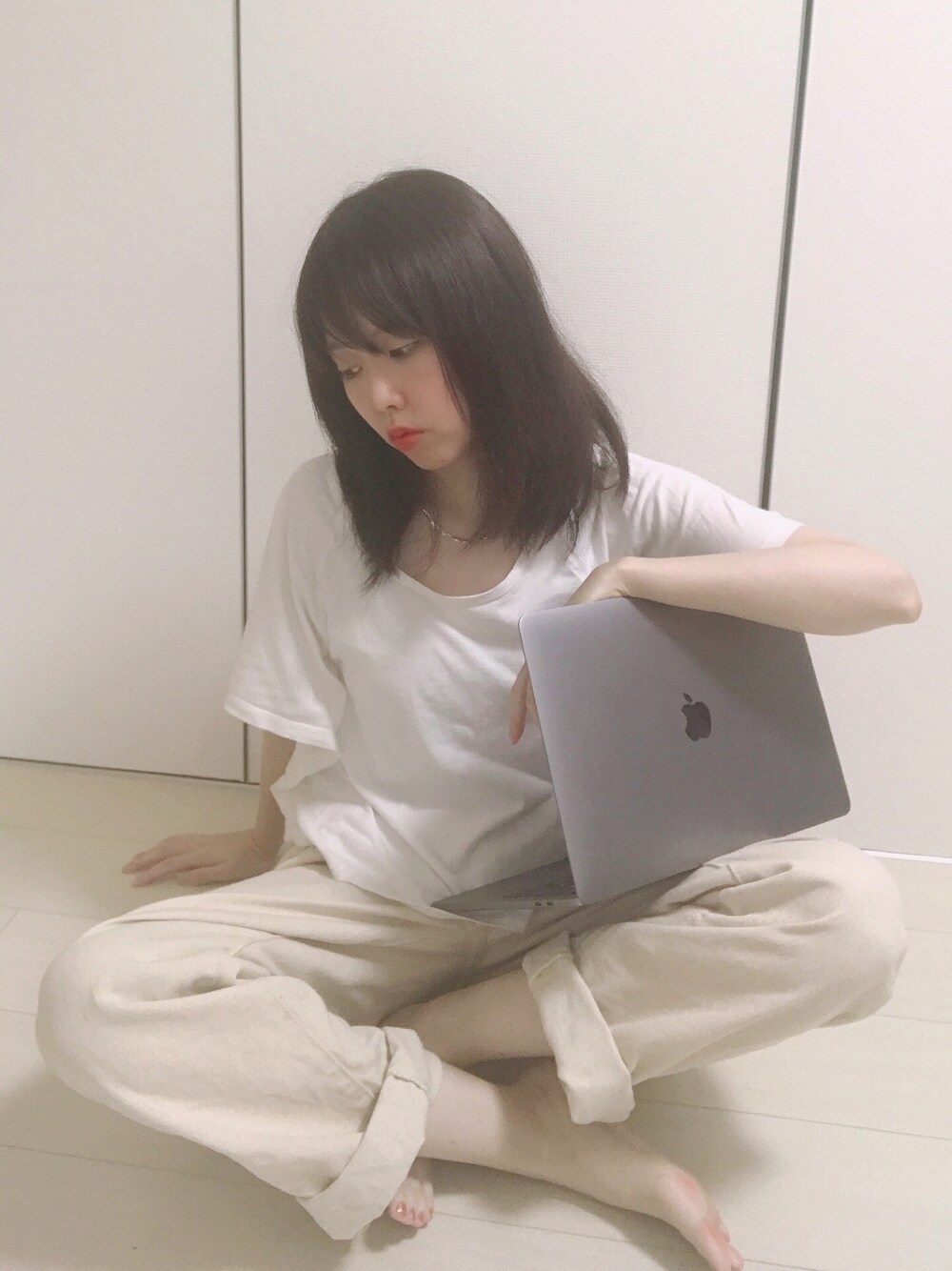 在宅勤務コーデ ラフな白Tなんだけどざっくり胸開きなのとほんのちょっと変わった形がお気に入り