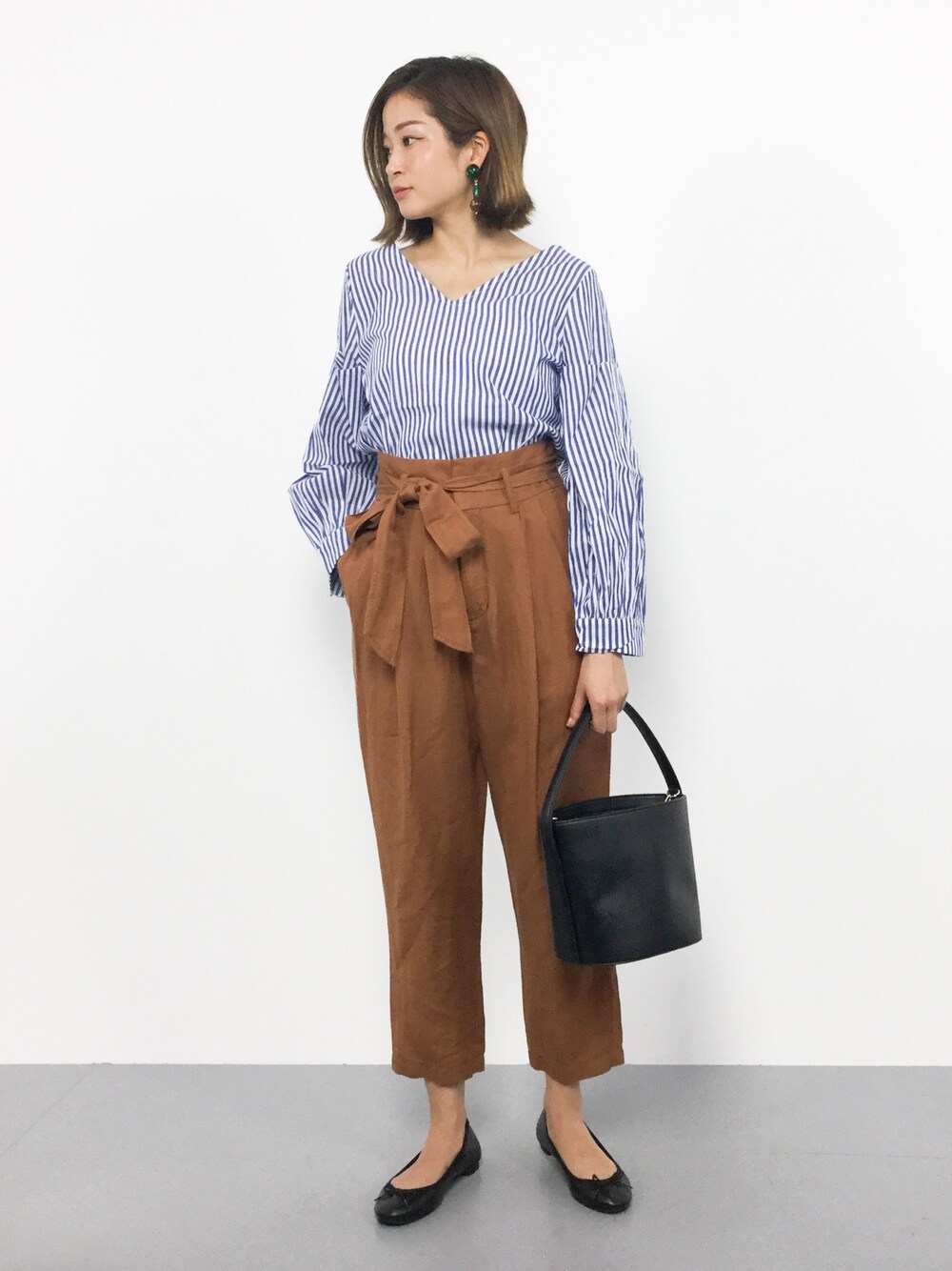 mihiroのTシャツ/カットソー「前後Vネックストライプバルーンスリーブブラウス」を使ったコーディネート
