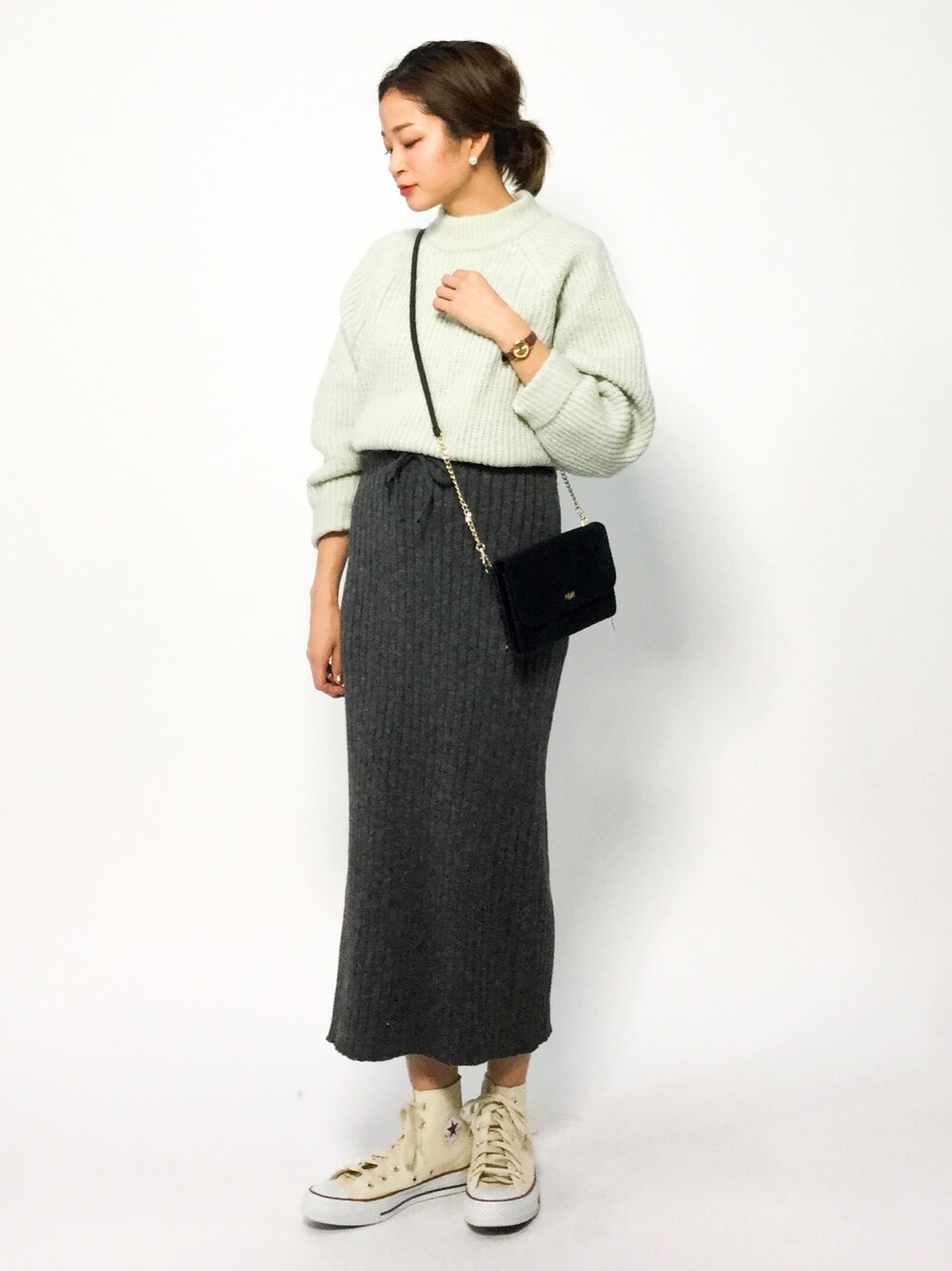 mihiroのスカート「<2018年秋冬素材で再入荷>ウエストストレッチで快適な履き心地♪リブニットミモレ丈スカート」を使ったコーディネート