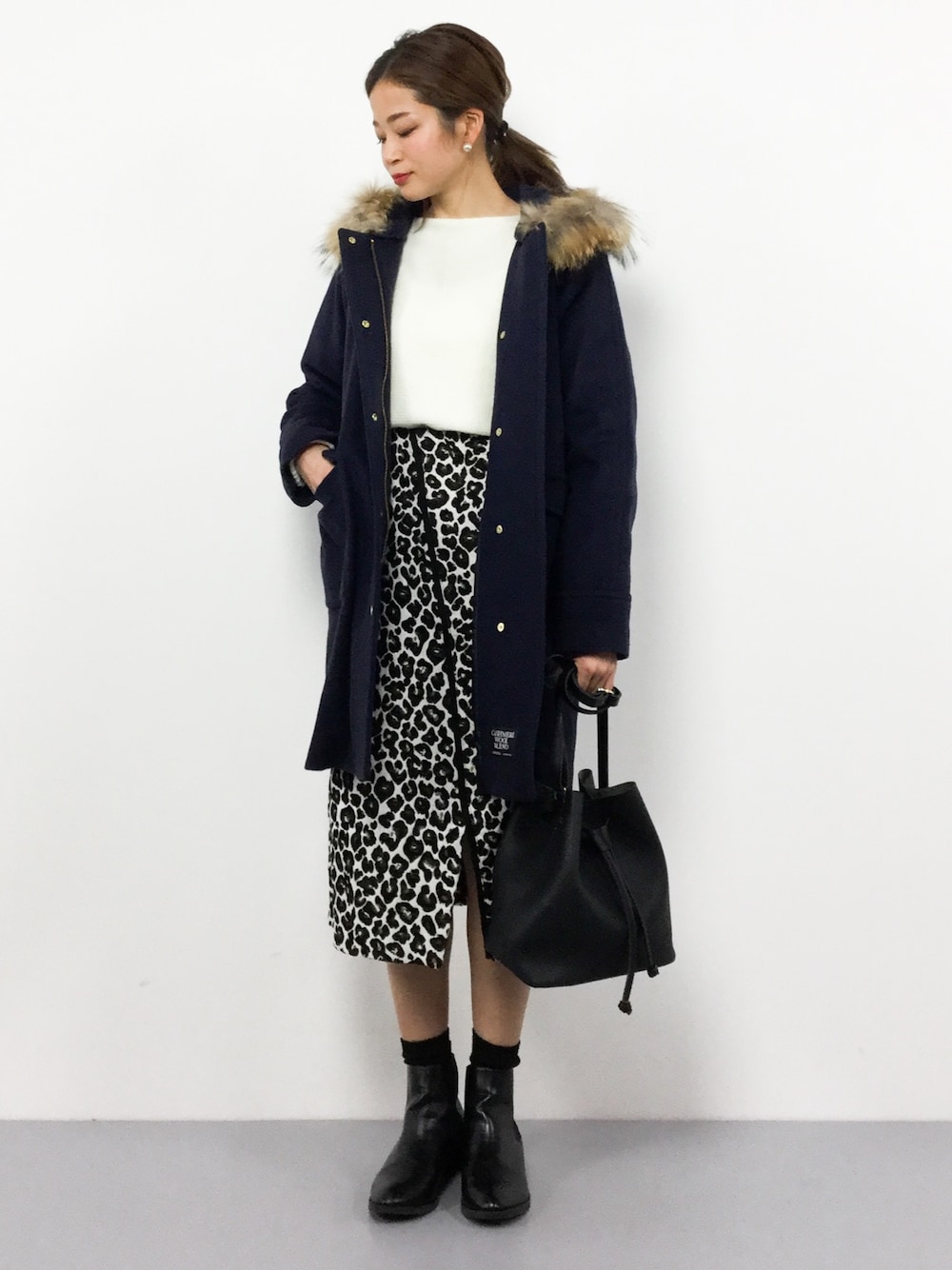 きれいめカジュアルコーデ 丈感が丁度よく、フードが取り外し可能な万能アウター。 フードのファーの程よいボリュームで顔まわりをスッキリと見せてくれます♩ まだまだ、冷えるこの時期にオススメです。