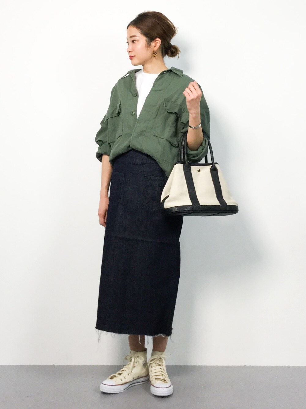 きれいめカジュアルコーデ 程よいボリュームが可愛く、今年っぽいミリタリージャケット。 コンサバアイテムに一点投入するとこなれ感が演出できます♩ 様々なアイテムにマッチするので一枚あるとコーデがさらに楽しめます!