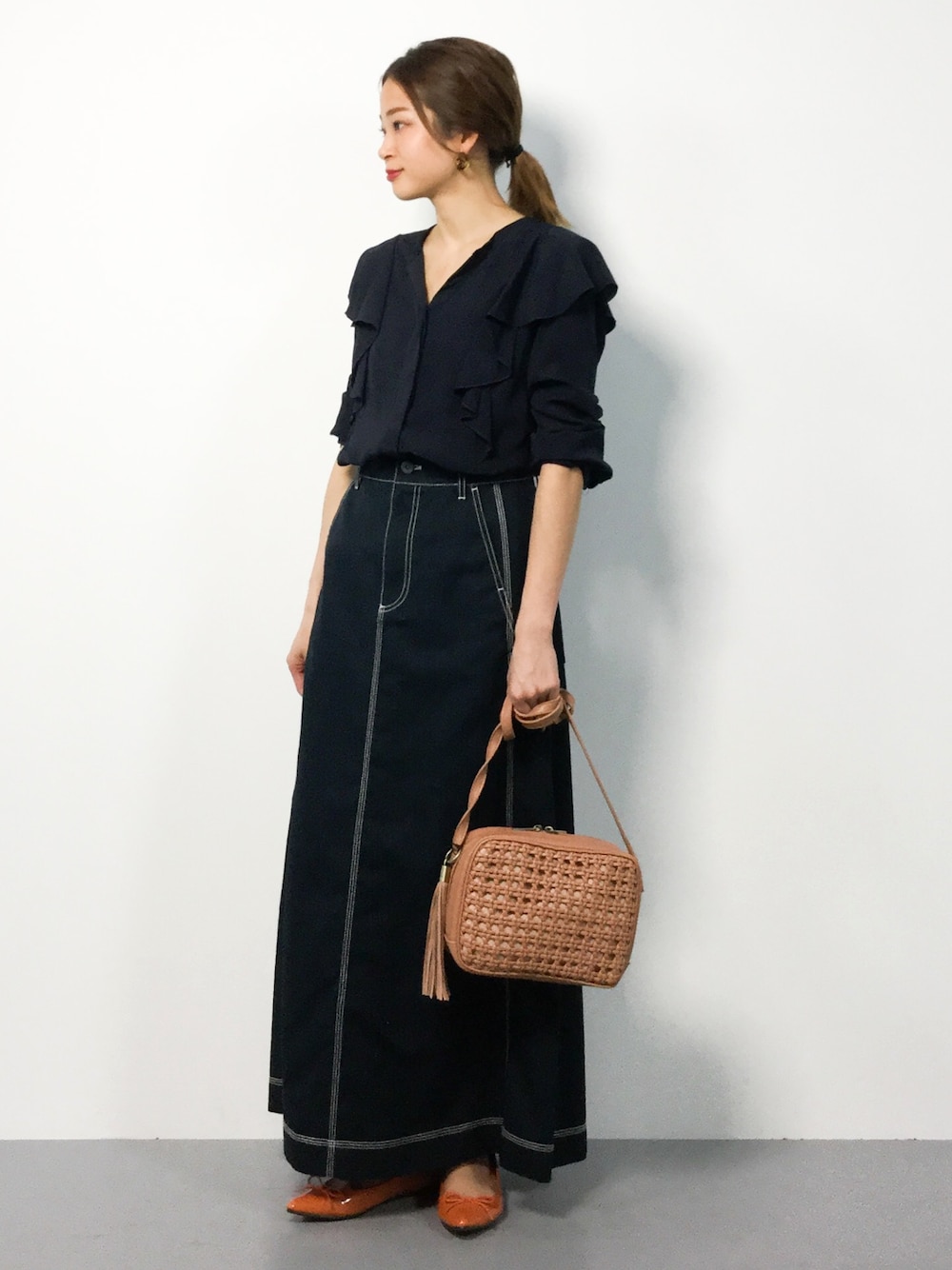 オトナカワイイコーデ ローヒールでもバランスの取りやすいマキシスカート。 ステッチが効いているので、お洒落度アップします♪ 一枚で主役になり色んなコーデを楽しめるアイテム!