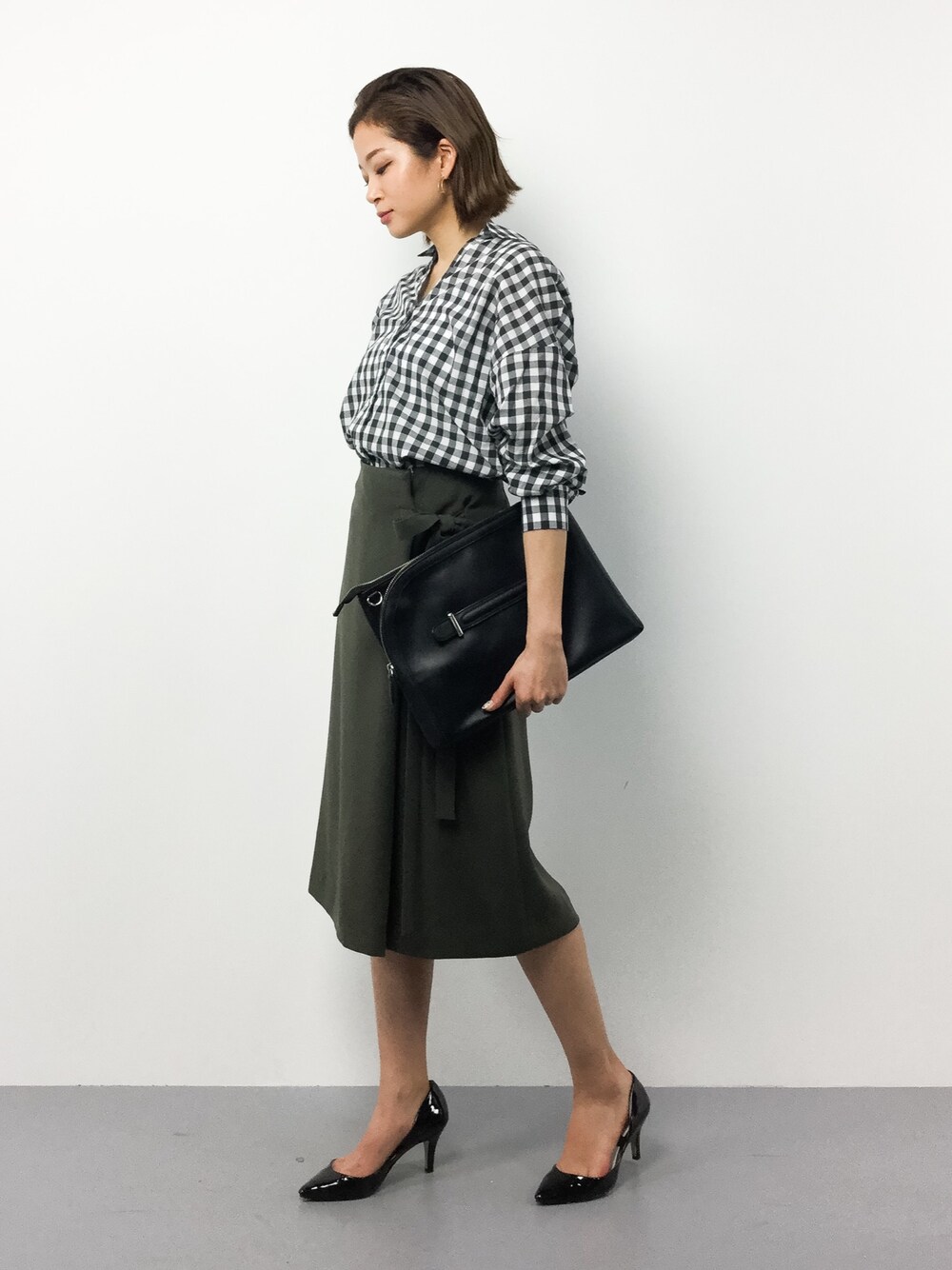 きれいめカジュアルコーデ シャツにタイトスカートを合わせて大人っぽさを演出しました。 かたくなりすぎないよう、ギンガムチェック柄をチョイス!