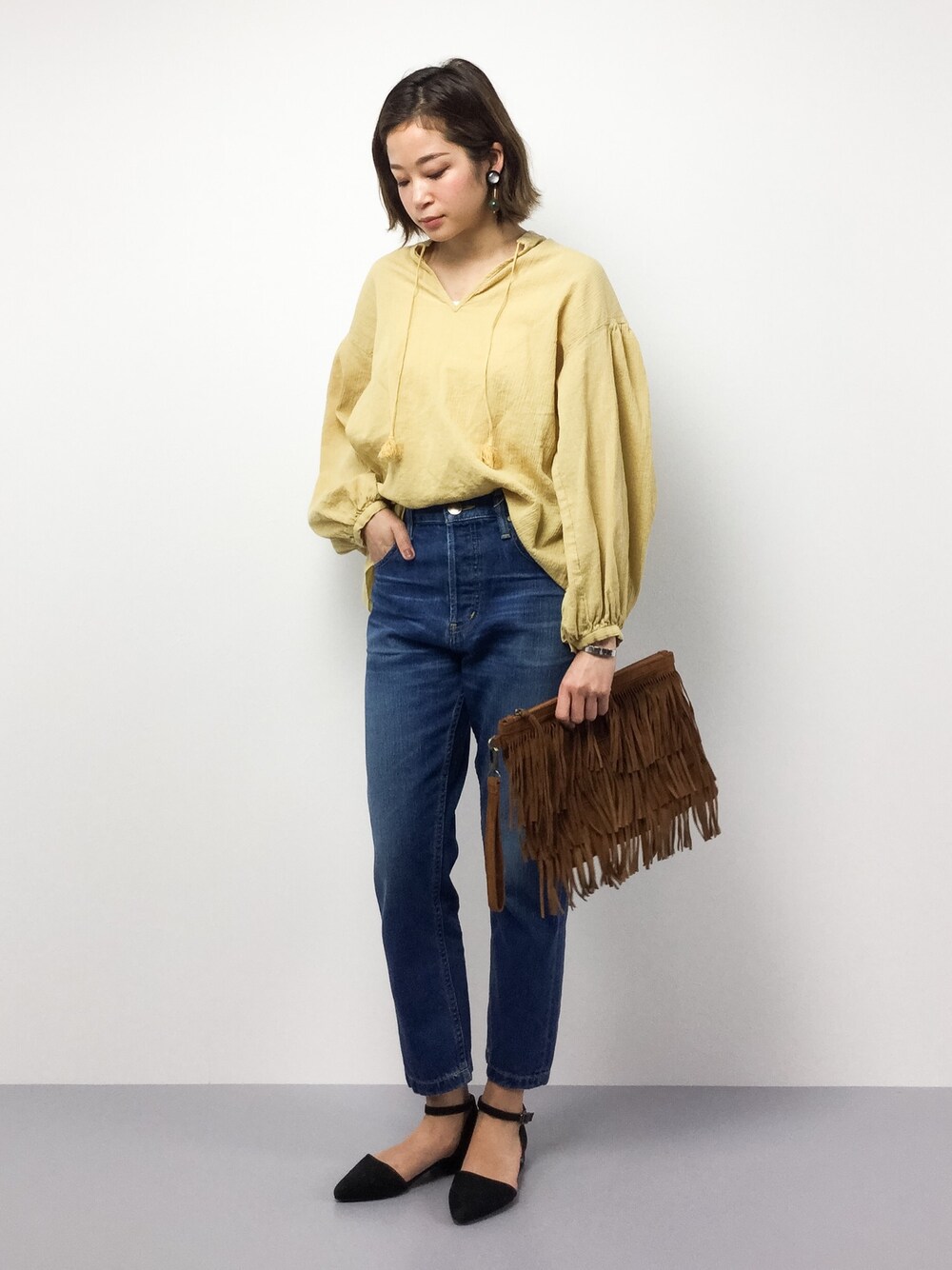 きれいめカジュアルコーデ 春らしいイエロートップスをメインにまとめました。 袖にボリュームがあるシャツは、カジュアルにもガーリーにも使えます。