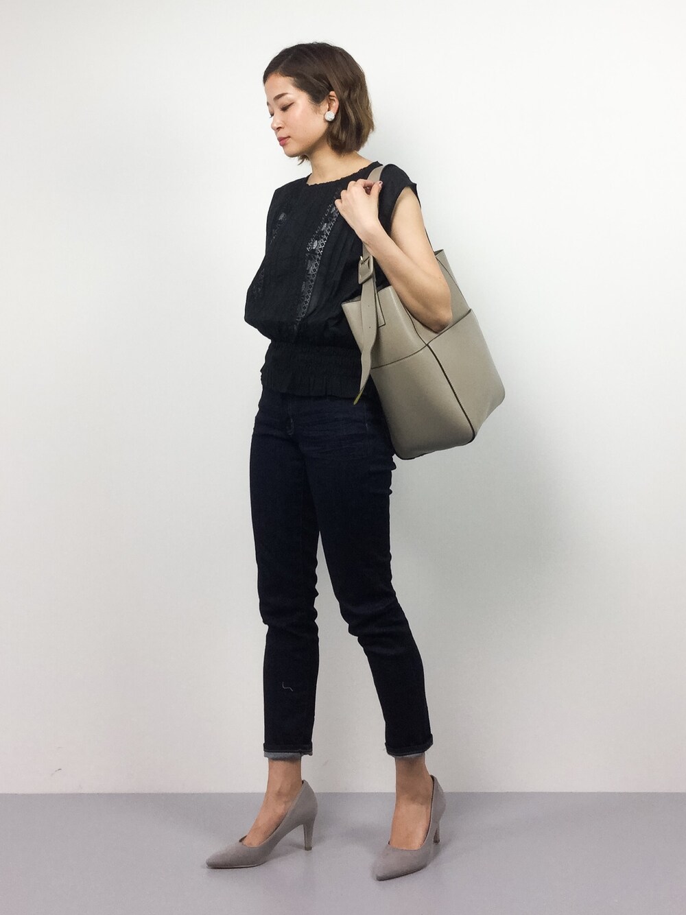 きれいめカジュアルコーデ 夏を先取りしました。 短めトップスにスキニーデニムを合わせて脚長効果◎ 大人っぽくタイトに仕上げました。