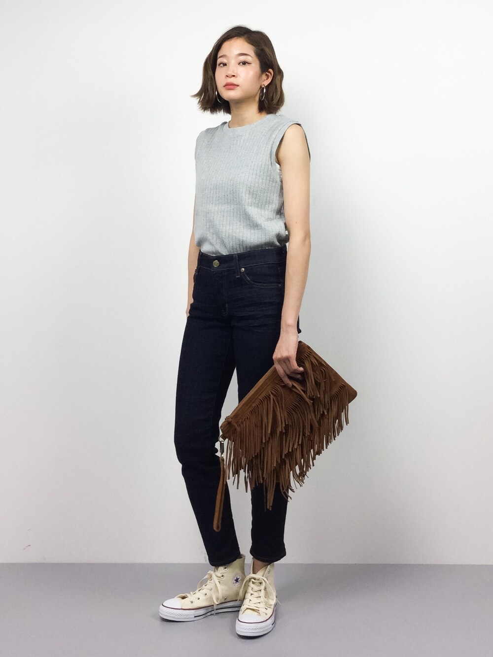 きれいめカジュアルコーデ 爽やかなタンクトップで夏を先取り! シンプルなスタイルにフリンジバッグでアクセントをに付けてみました。