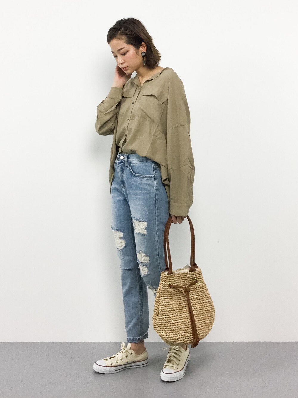 きれいめカジュアルコーデ ゆるめのシャツをデニムにインしてバランス良く! 小物で爽やかにまとめました。