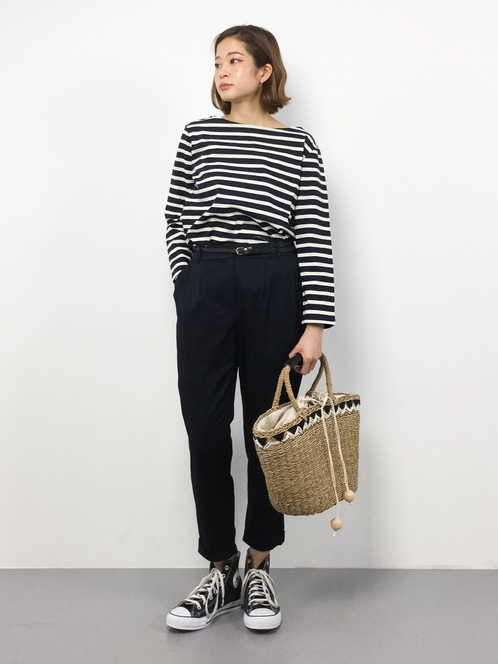 キレイめカジュアルコーデ ボーダートップスは、素材がしっかりしていて型くずれしなさそうでした。 キレイめからカジュアルまで幅広くお使い頂ける万能アイテムです。 パンプスを合わせて、大人っぽく仕上げるのもオススメです!