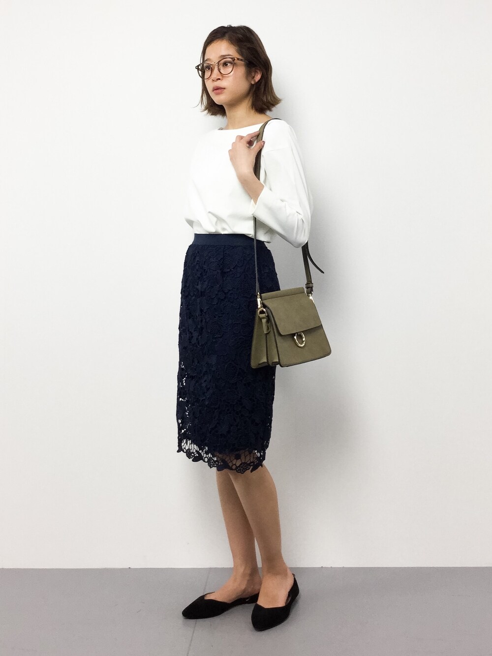 キレイめカジュアルコーデ モノトーンのアイテムでまとめて、ポイントにカーキのバッグを取り入れました。 タイトスカートは、穿いてみるとシルエットがキレイで156cmの私でも丈感がちょうど良かったです。 レース素材で涼しげなので、春に大活躍間違いなしです!