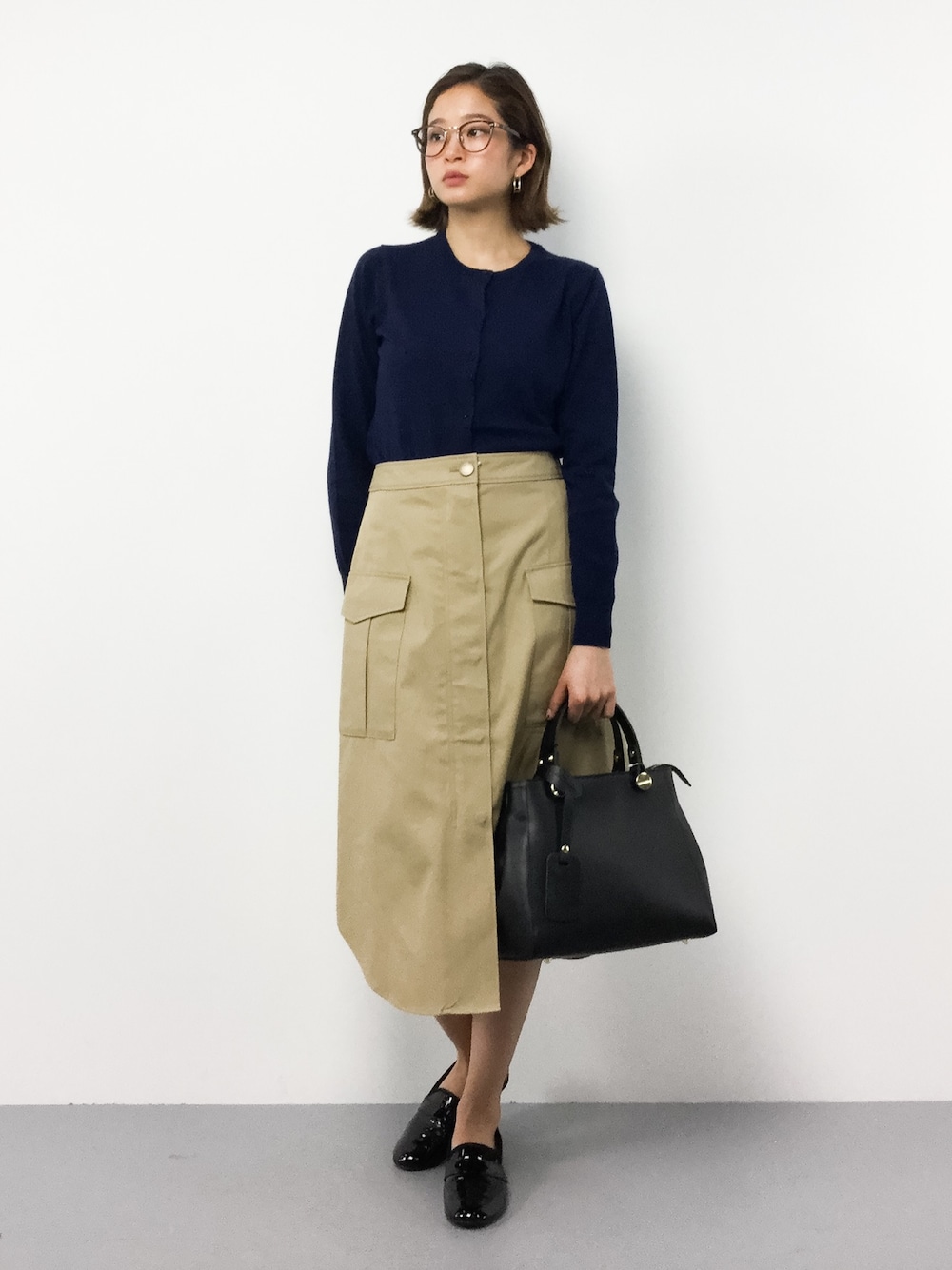 キレイめカジュアルコーデ インスタイルにして、足元をスッキリとまとめました。 ベージュのスカートは、156cmの私でも丁度良い丈感でした! これからの季節、大活躍しそうなアイテムです。