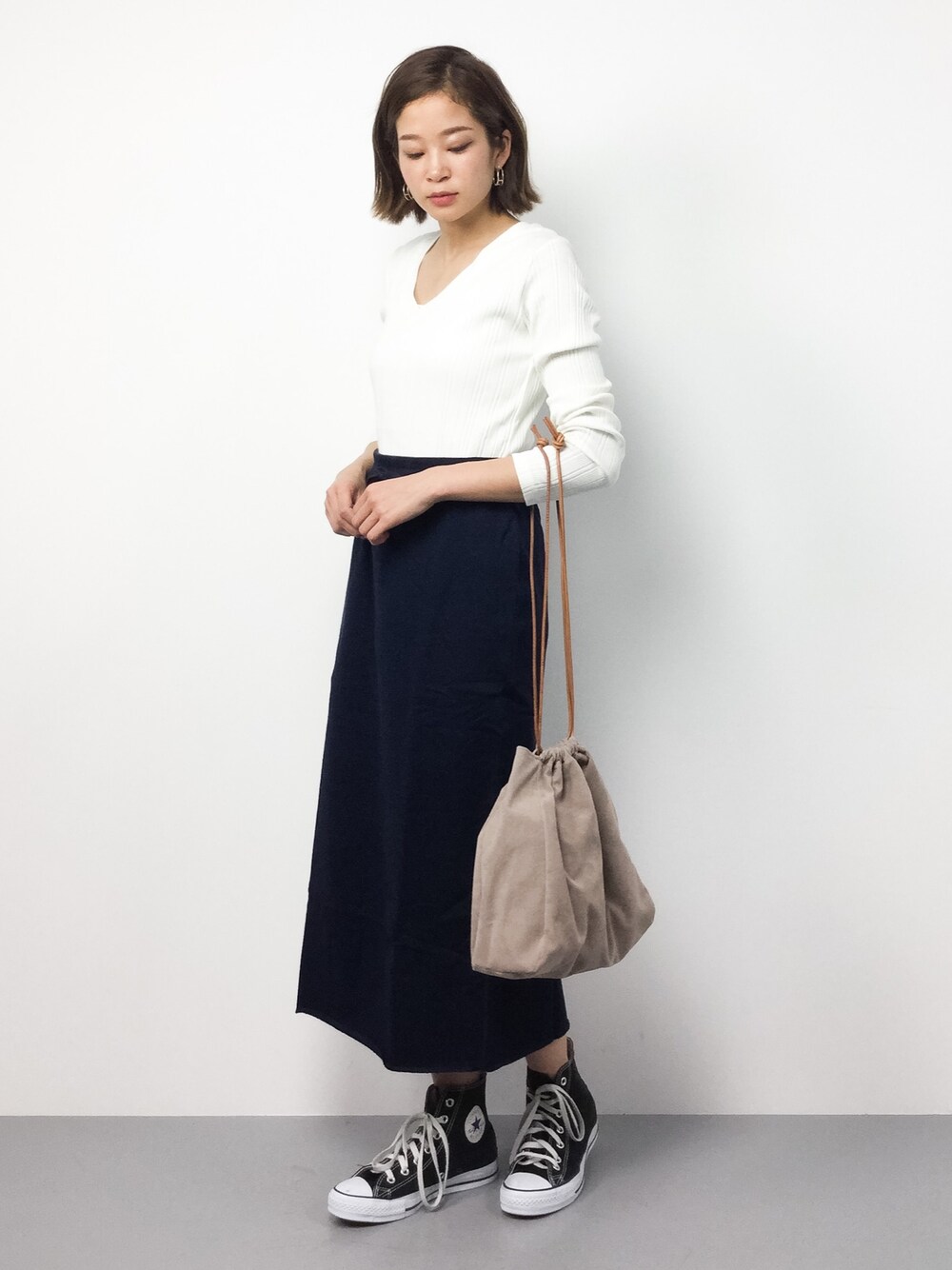 きれいめカジュアルコーデ モノトーンアイテムを使ったスタイルに優しいカラーの巾着バッグをプラス! トップスは、丁度良いVネックなのでデコルテを綺麗に見せてくれます。 そして、着心地がよく体に馴染むのでストレスなく着られます。