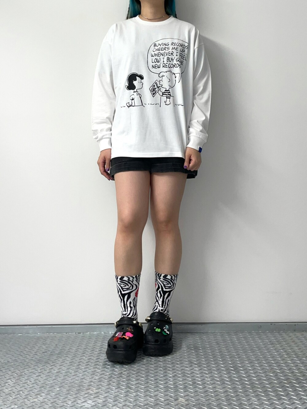 ボンジュールレコードとピーナッツコラボのロンTはしっかりめのコットンで気崩れしにくい素材感🍃 フロントは音楽に因んだグラフィックがキュートでバックにも一面に文字プリントがあるので一枚で着てコーディネートの主役として取り入れたいロンTです🌟 カラーは全4色。ホワイトは王道に着やすいですね😎