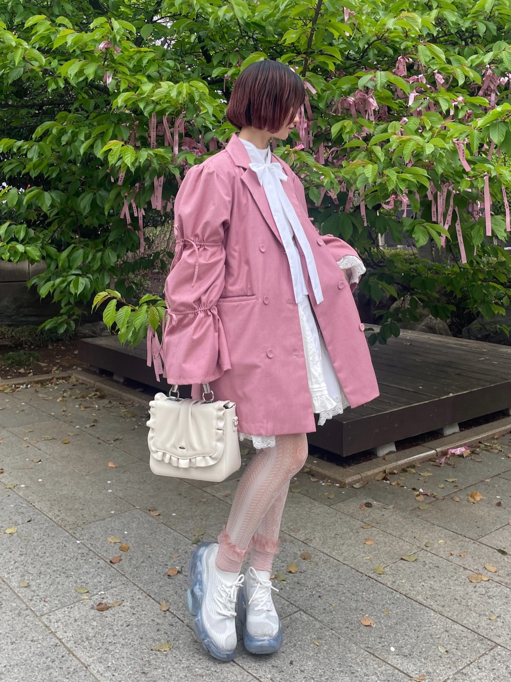 もう桜散ってるところが多いけど また気持ちは桜満開!!!🫶 いつも黒コーデが多いけど 春になるとピンクが着たくなる🌸 靴下もジャケットのピンクに合わたよ◎