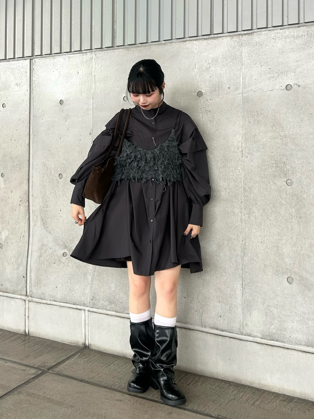 ボリューム感がかわいいシャツワンピを使ったモノトーンコーデを組んでみました!✨ ビスチェと重ねても可愛いし一枚でワンピとしてきても可愛いです〜 パンツと合わせても雰囲気変えて着回していただけます👌🏻💖 ロングブーツ合わせがおすすめです♪ 是非チェックしてみてください!