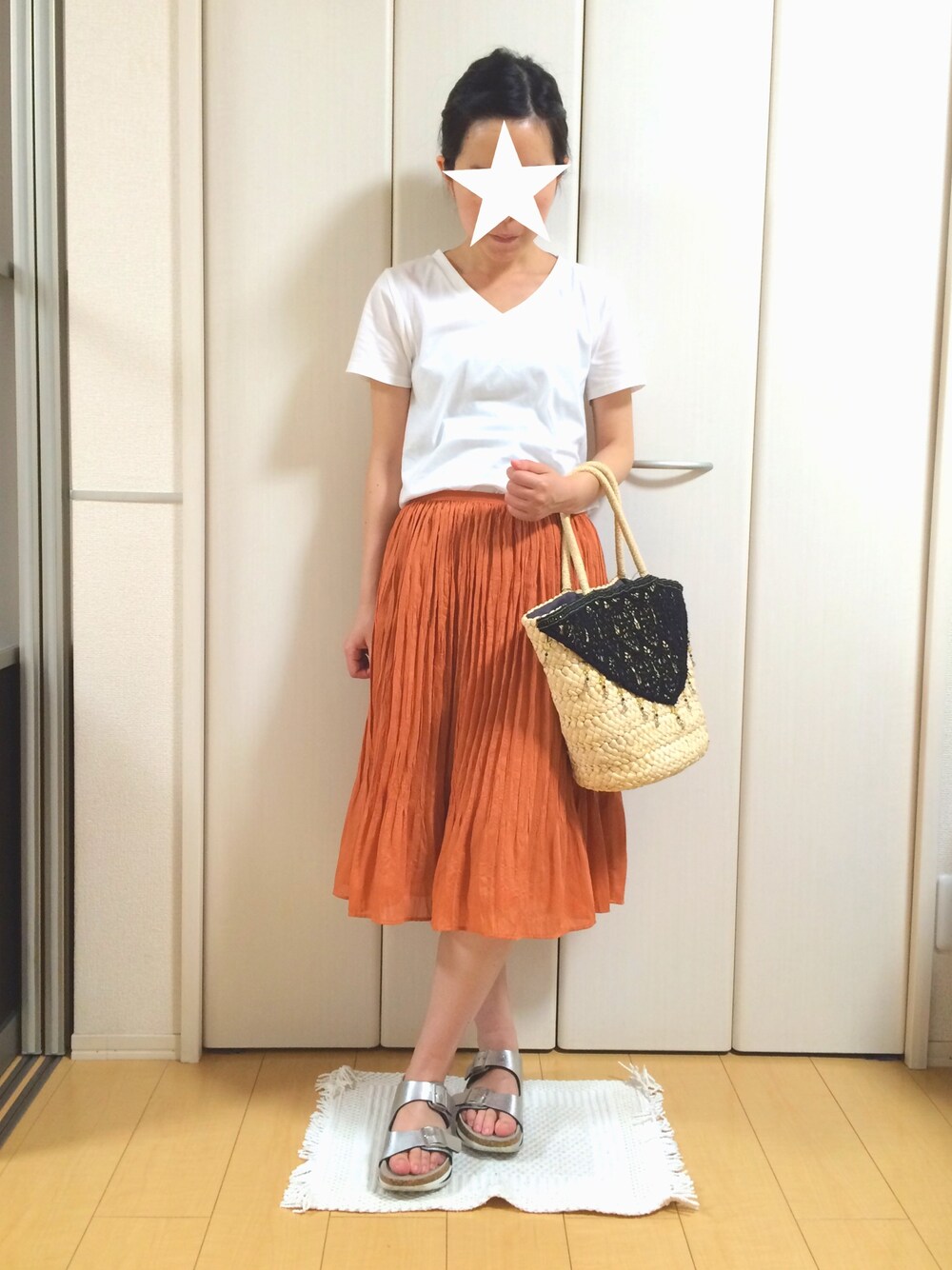 今日のコーデ。 トップスとスカートはナチュラルビューティーベーシックのセールで^ ^ テラコッタカラー(実際はオレンジ?)はやっぱりかわいい! 夏が終わるまで沢山着ようと思います😍