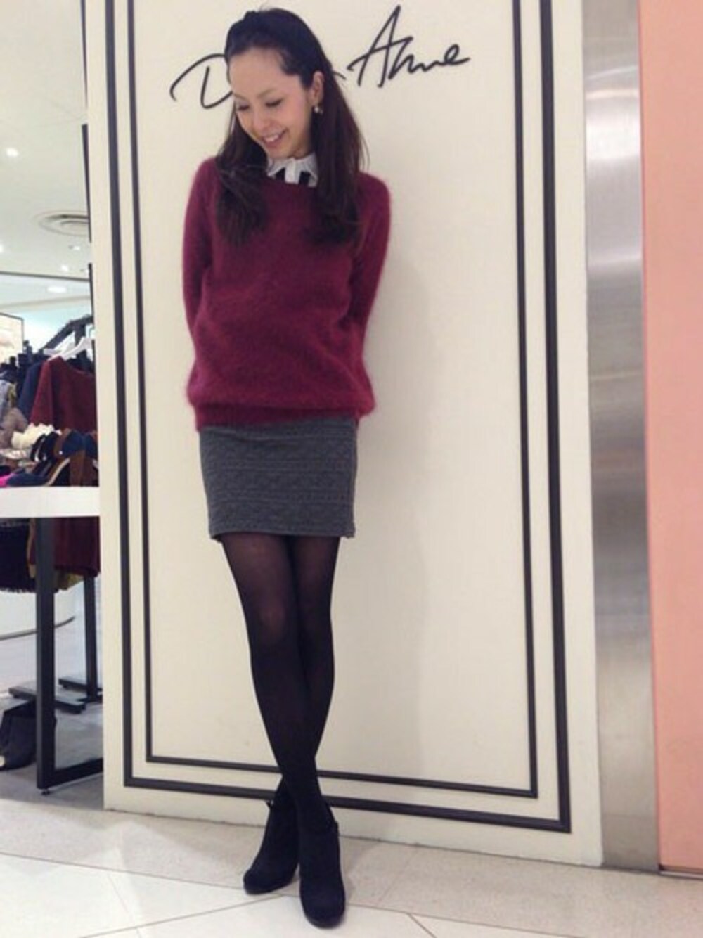 アンゴラニットの中にシャツをレイヤードしたスタイル♡ タイトスカートを合わせてすっきりとコーディネート。 ニットは完売中ですが、もうすぐ再入荷ができそうです^^