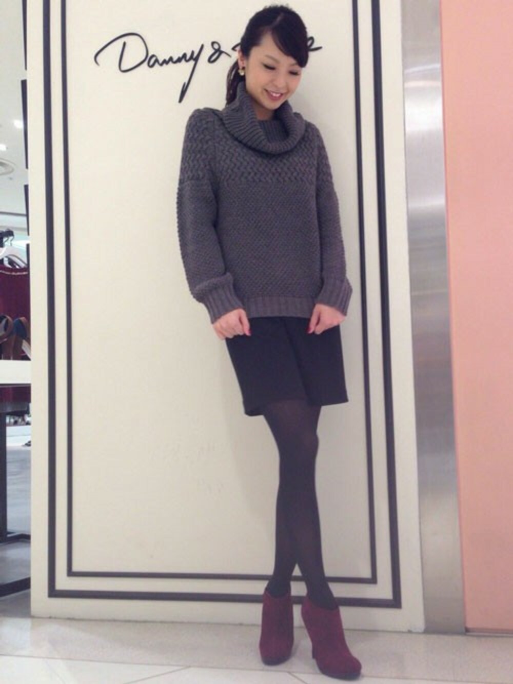 チュールスカート付きのドレスを、シンプルなワンピとして着用し オフタートルのニットと合わせました。 ダークカラーでまとめ、WINEのブーティーをポイントに♡