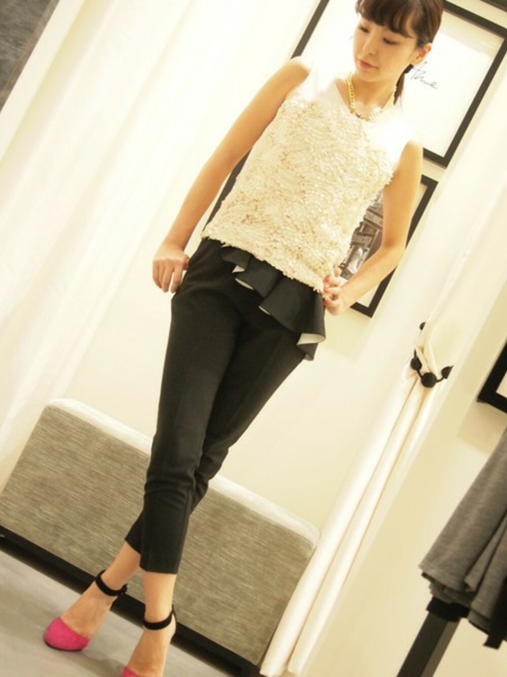 フラワーモチーフのような淡いピンクベージュのトップスに、 アシンメトリーぺプラムの美シルエットパンツを合わせ、 フェミニン且つモードな印象のスタイリング♡ 秋色が着たい今、おススメなコーディネートです!