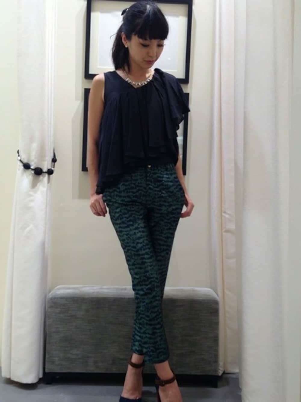 アシンメトリーで綺麗なフレアー感のトップスを サテンのプリントパンツにインしたスタイリング♪ 落ち着きのある秋色コーデ、グリーンをポイントにしました!