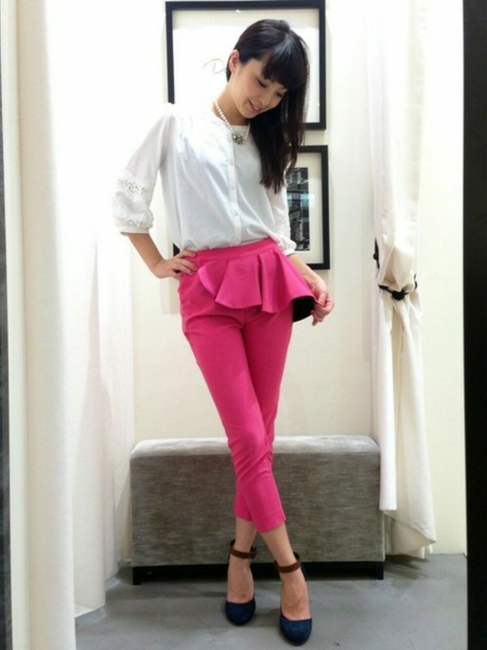 袖のレース切り替えがポイントの、フェミニンなブラウスには ピンクのフレアーラップパンツにインしたスタイリングがオススメです! アクセやシューズで遊んでも◎!