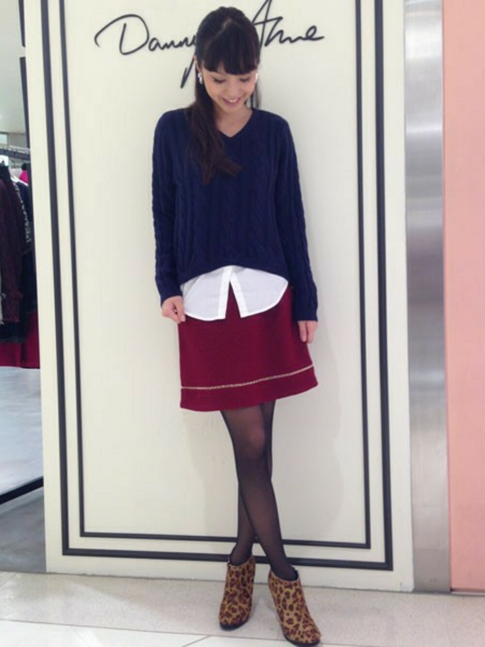 シャツを重ね着しているようにみえるニットに、 裾のチェーン装飾がポイントのウールスカートを合わせてレディな雰囲気に♡ 耳元のスワロフスキーのピアスもポイントです!