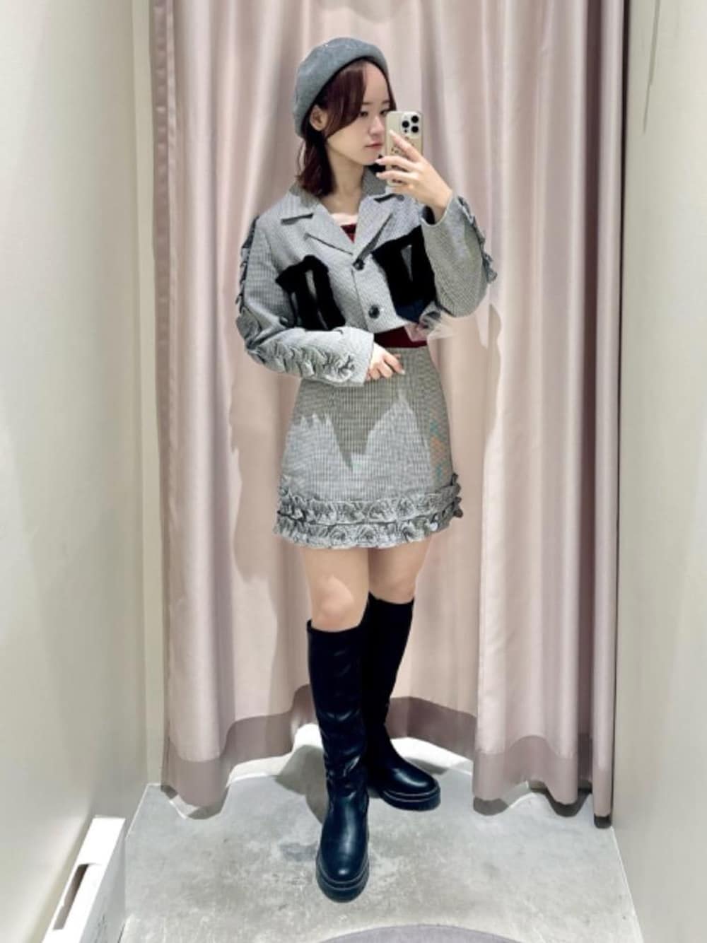 157cm/骨格ウェーブ 【outer】秋冬になると1着は欲しくなるジャケット🩶リボン付きですが取り外しできるので、外して着てもお好きな場所に付け替えても🙆♀️ショート丈なのでスタイルアップもできちゃいます!肩から袖にかけてのフリルもめちゃ可愛いです🥹【bottom】ジャケットとセットアップで着られるスカパン!ミニ丈でも安心の履き心地です👍セットで着ると甘すぎてしまう方はスカート単体の着回しができるのでおすすめ🌟少しタイトなシルエットなので、可愛くなりすぎない大人かわいいアイテム!【shoes】去年も大人気だったストレッチ素材のロングブーツが今年も登場です!厚底で美脚効果も◎なにより安定に抜群のクッション性で長時間歩く日でも疲れにくいのが嬉しいポイント!