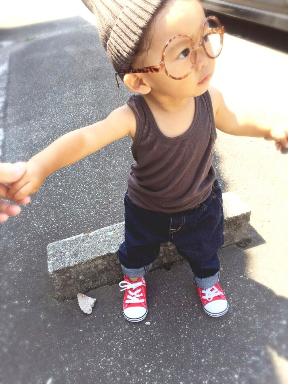 見ていただきありがとうございます🙏 ドラフト参加中にもかかわらず、GAP着てない… すみません💦GAPのもの、長袖や厚めの生地ばかり…暑さに勝てませんでした😱 涼しい日を狙って着せていきます✋😂 今日は韓国さん×久々デニムー♡ うん、デニム汗かきベビには暑い😰 赤コンも久々😘れっとさん最近靴を選んでもってくる…今日はコレがいいだって〜笑 なんてことないシンプルコーデなので丸めがね👓かけました🤓🤓🤓💗