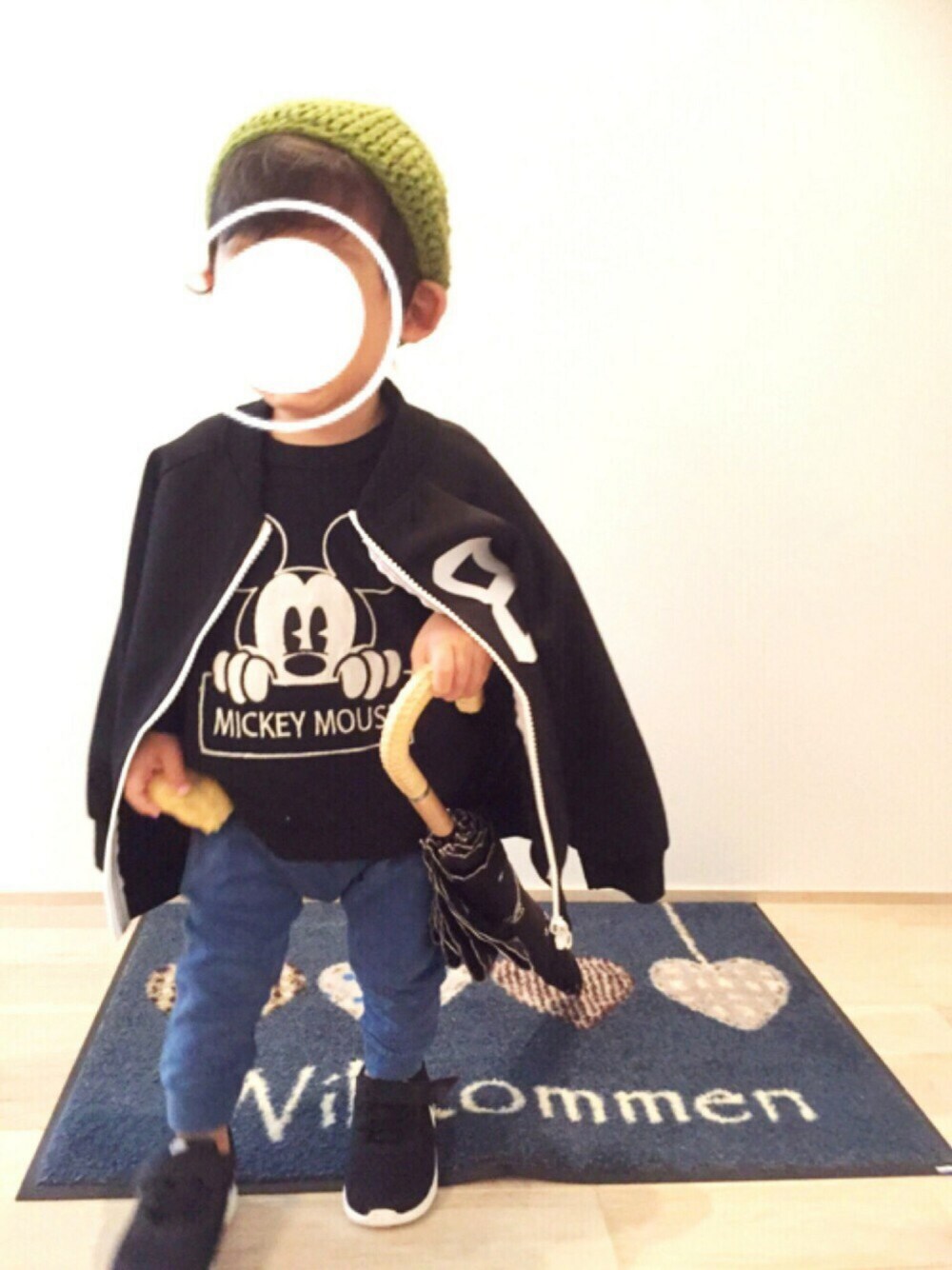 見ていただきありがとうございます🙌 ♡、save、コメントとても嬉しいです😍 最近、お気に入りの母ちゃんの日傘… コレを持たないとなりませんといわんばかりに取ってくれと毎日玄関で騒ぎます😒そして手にするとそのまま家の中に突入します…危険ですのでやめていただきたい😱😱 ユニクロのミッキーロンT購入しました✨ 80にしたけど、90でもよかったかなー🙊 ニット帽は黒でまとめてもよかったんだけど、あえてポイントにグリーンに✋💕
