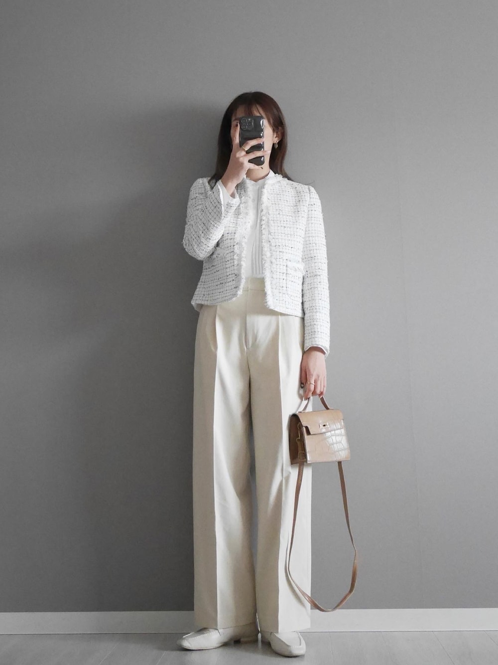 miiのノーカラージャケット「ミックスツィードノーカラー ジャケット」を使ったコーディネート