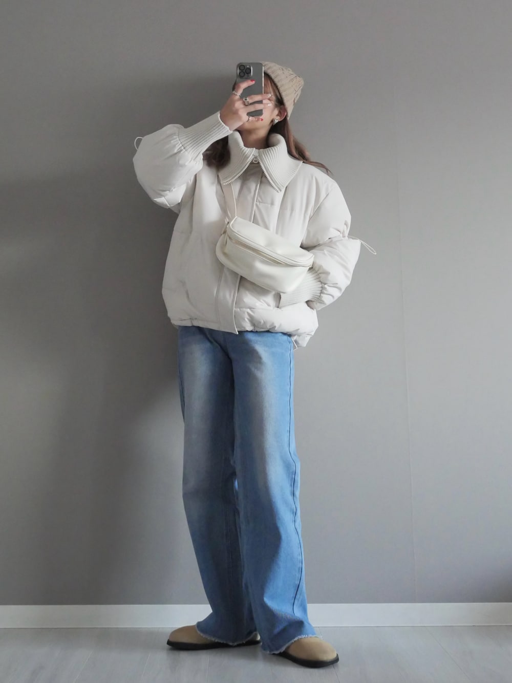 miiのダウンジャケット/コート「フェイクダウン襟リブブルゾン」を使ったコーディネート