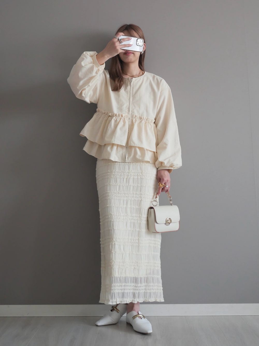 miiのノーカラージャケット「ナイロンペプラムジャケット」を使ったコーディネート