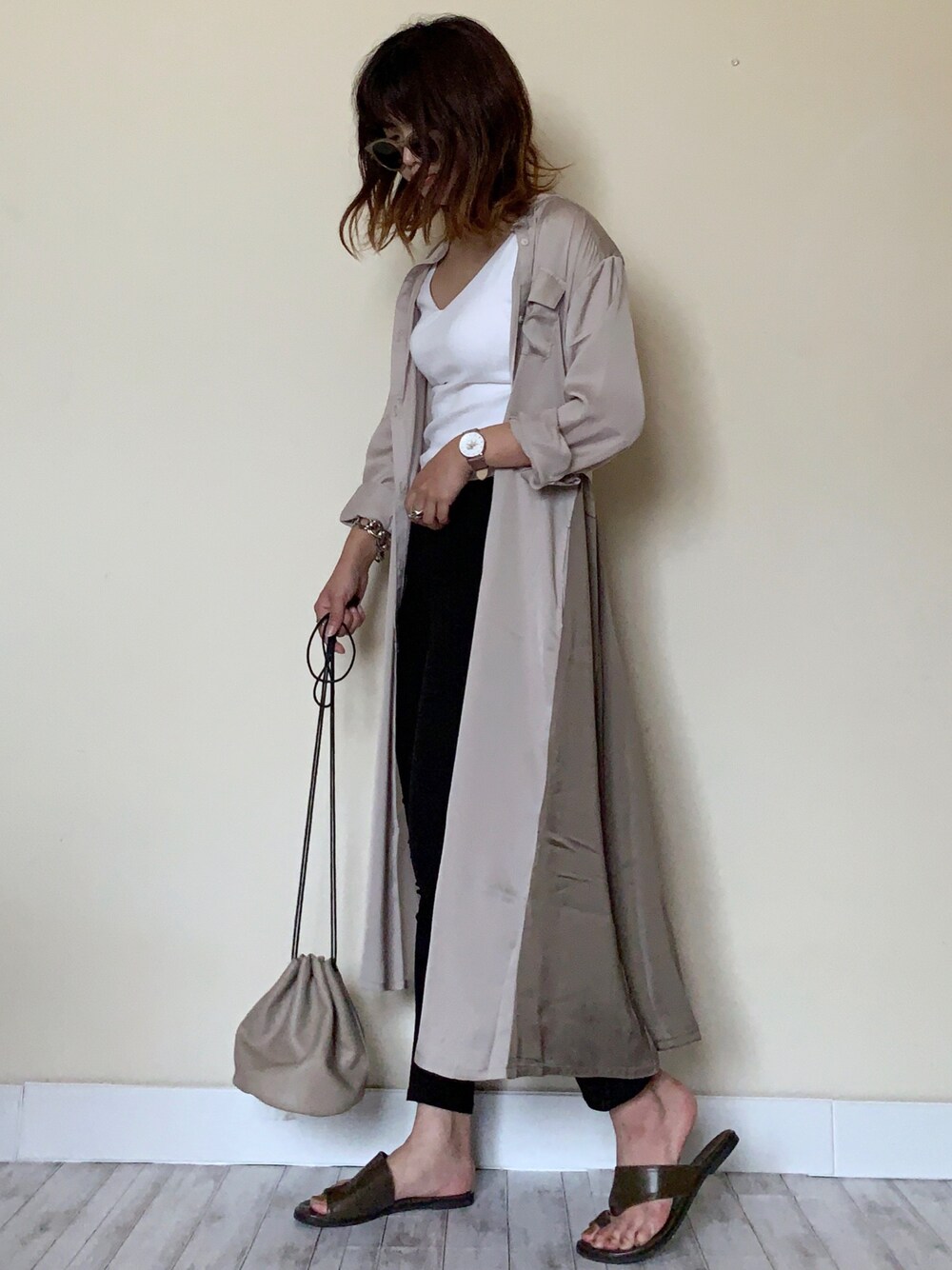 Instagram:mii_wear サテンシャツOP サラッとした肌触りで気持ち良い☺️ バックドレープがポイント♡