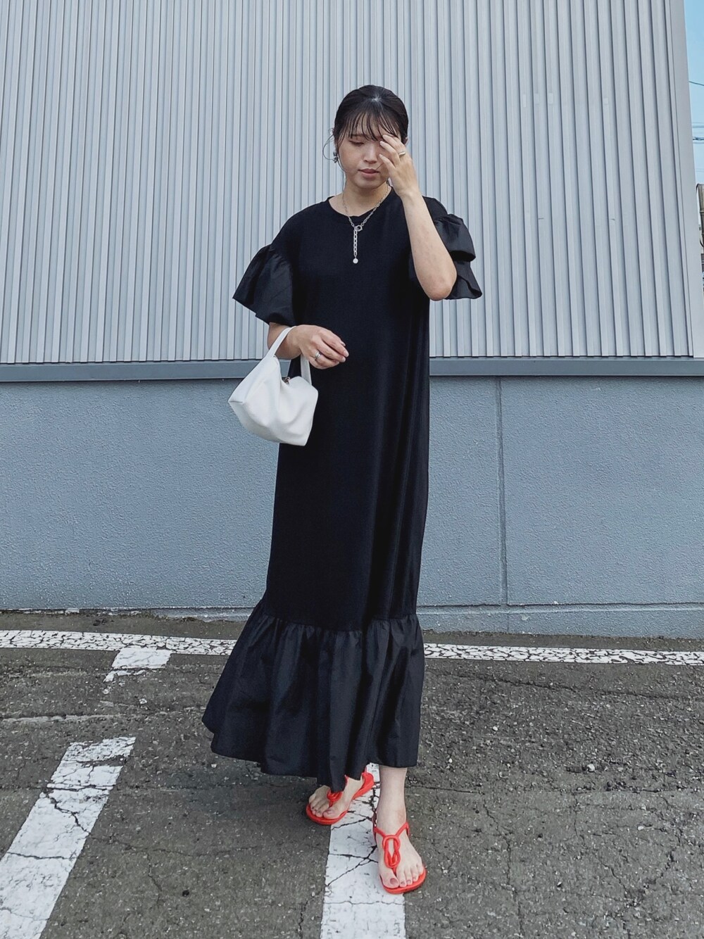 Miiのワンピース「異素材ドッキングフリルスリーブロングワンピース【洗える】」を使ったコーディネート