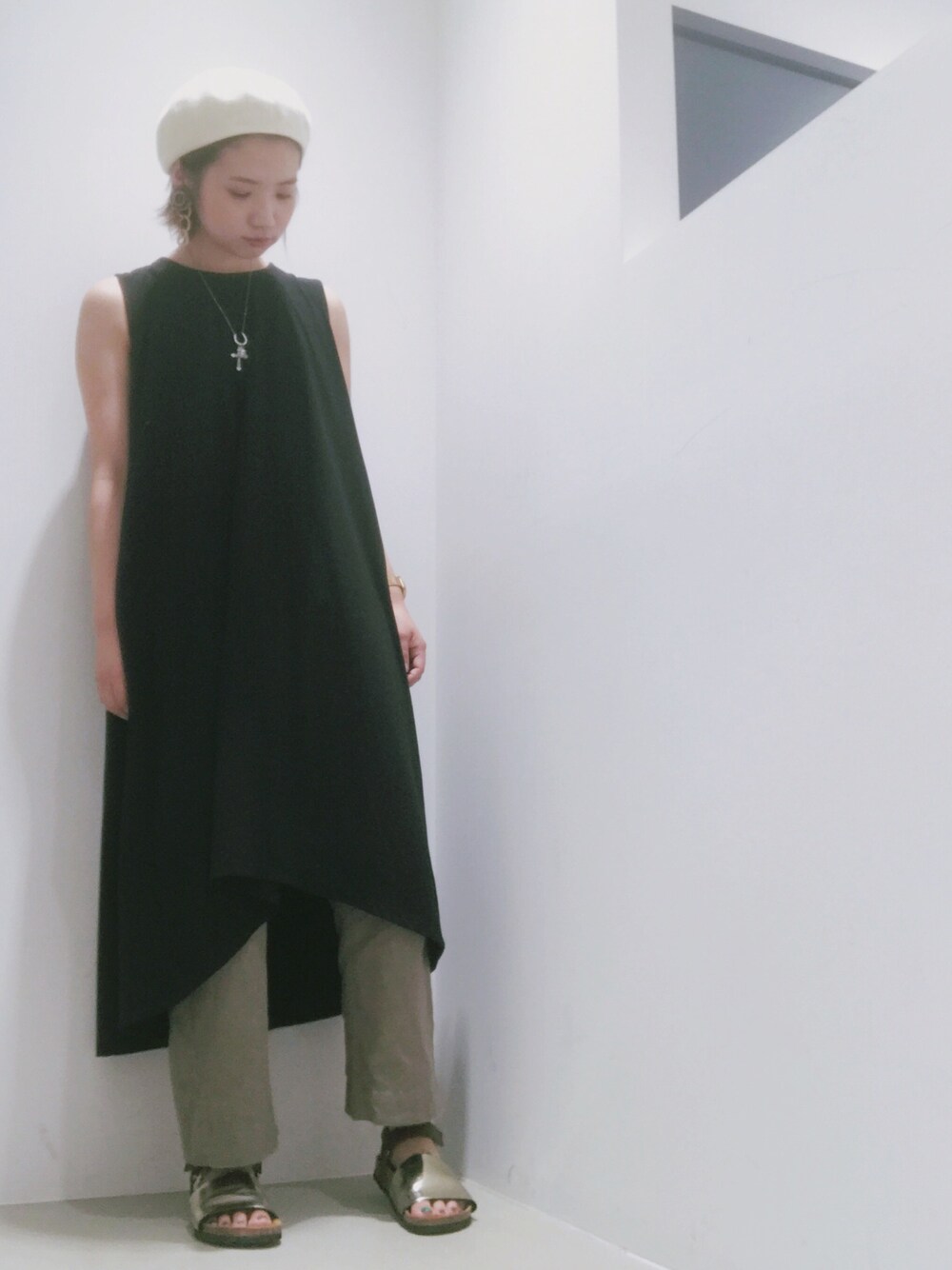 misakiのワンピース「イレヘムバックフレアノースリーブワンピース *」を使ったコーディネート
