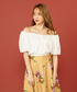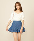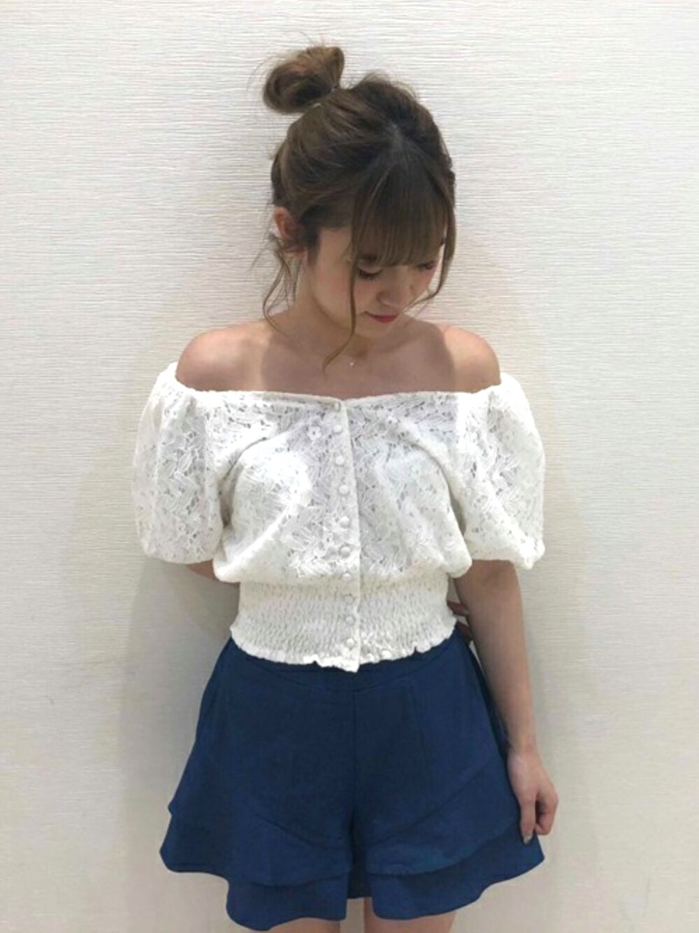 レース素材で女性らしさたっぷりのブラウス。 肩を落としても着れる仕様でデコルテをきれいに魅せ、パフスリーブが二の腕を華奢に魅せてくれます。 コンパクトな丈とフィット感のあるウエストのデザインがスタイルアップの秘訣。ボリュームのあるフレアキュロットとも相性ばっちりです。