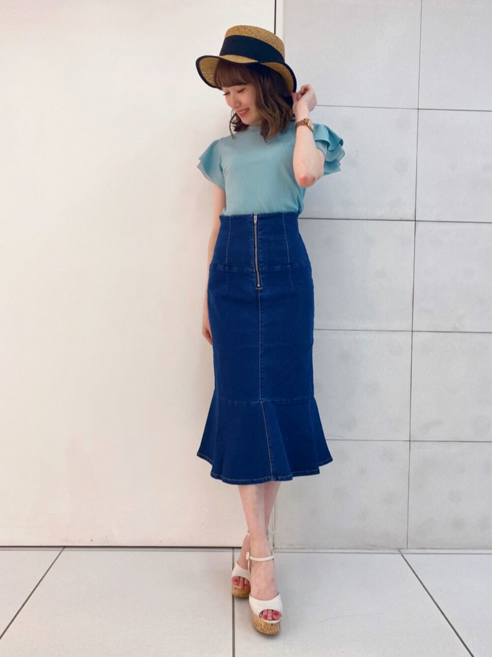 大人気のマーメイドデニムスカート♪ 夏らしく爽やかな大人かわいい夏コーデです◎ 札幌パセオ店 Hina 163cm