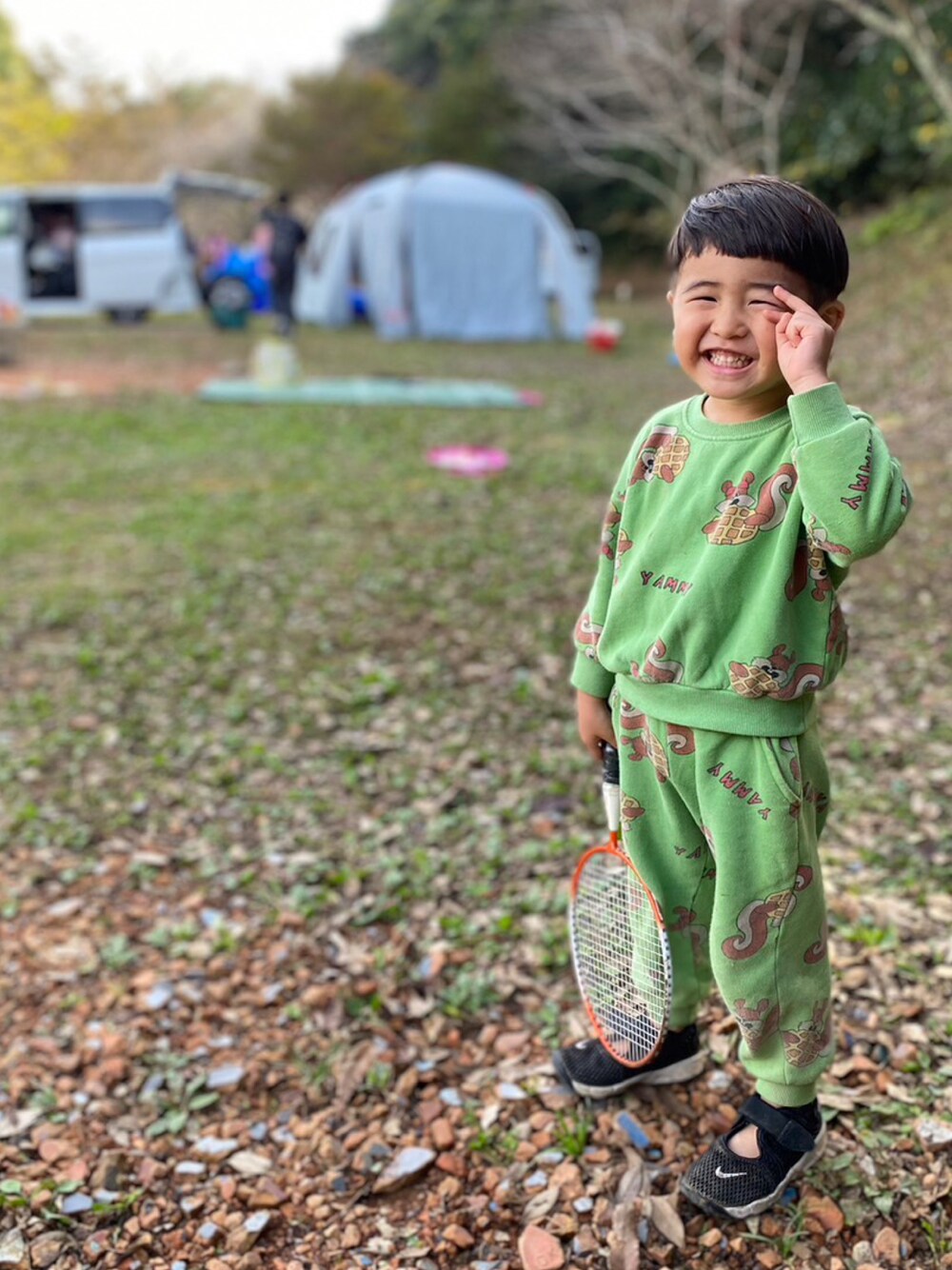 グリーン系のルームウェアを着用したキッズの秋コーディネートの1枚目の写真