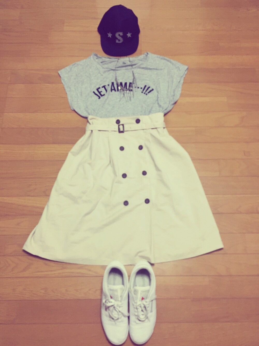 膝下丈のスカートで上品さと、ロゴTとキャップ、スニーカーでカジュアルさを合わせてピクニックしたくなるようなイメージで考えました☆(笑)