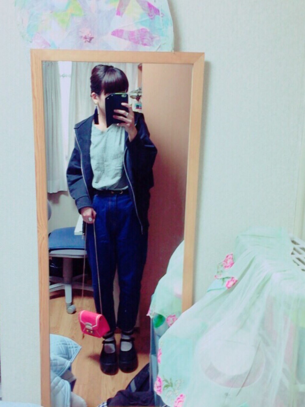 服はラフだけど、フリンジピアスとヘアスタイルと鞄で女っぽさをだす。