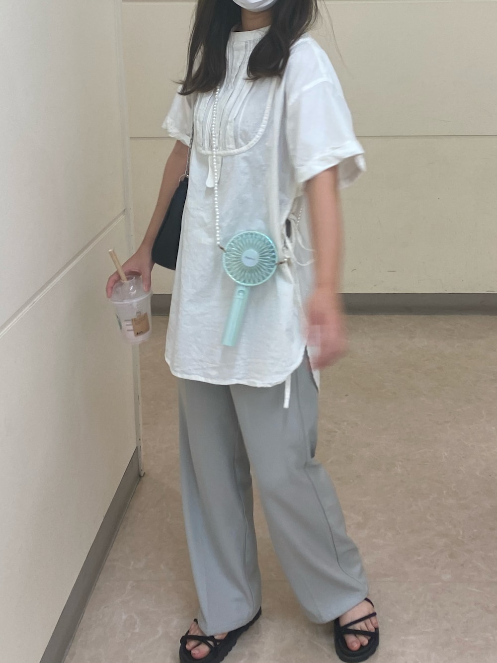 夏を感じる涼しげコーデ🌞 扇風機とパンツの色味が似ていて統一感🥺🤍 可愛いです⸝⸝⸝♡︎