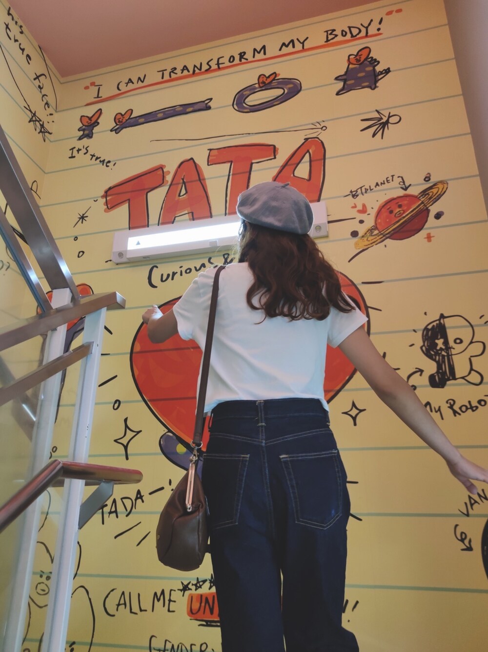 ホワイト系のTシャツ/カットソー、ブルー系のデニムパンツ、ブラウン系のショルダーバッグを着用したレディースの秋コーディネートの1枚目の写真