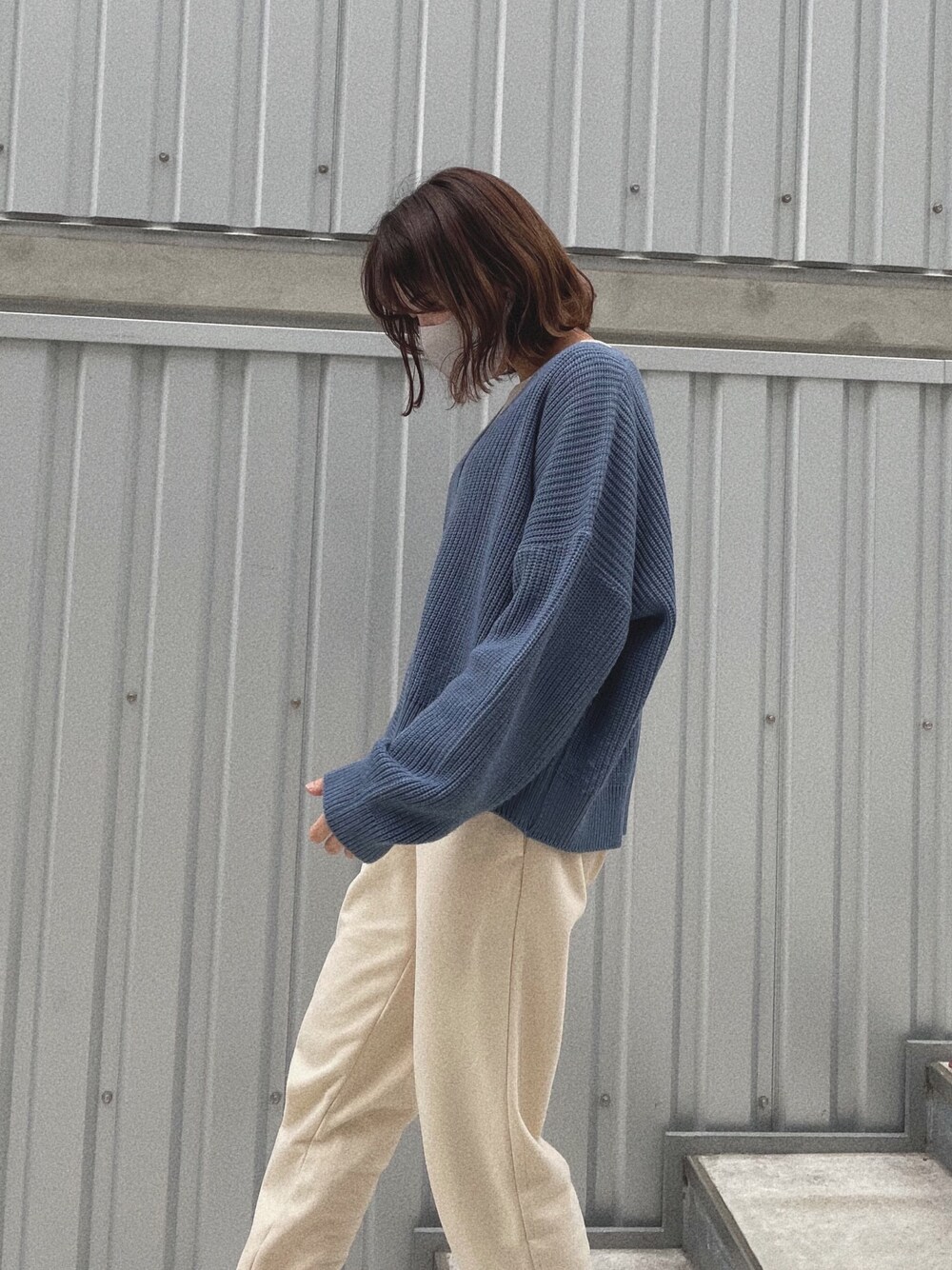 ホワイト系のスウェットパンツ、ブルー系のカーディガン/ボレロを着用したレディースの春コーディネートの1枚目の写真