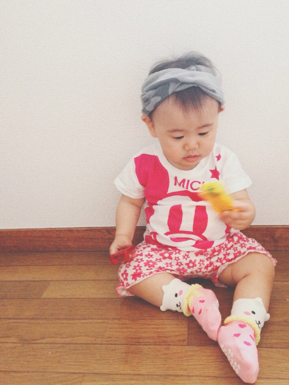 ママのスカートを切った切れ端で ヘアバンド作ってみました🐷🐷 全身ピンクちゃんで頭だけグレー でわけわかんないけど(笑) 西松屋ガール。