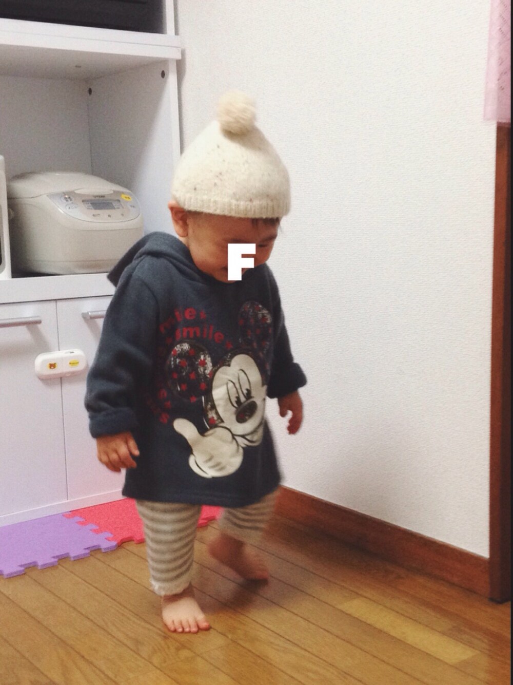 いとこのお兄ちゃんから お下がりのミッキーパーカー🐹 95cmだからワンピース(笑) ニットキャップもお下がりで 小人さんでかわいい👯👯