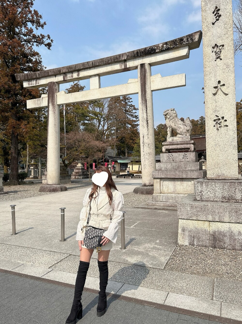 三重で行われた梅まつりに行ってきました🌸⛩️ 春らしさを意識して、Darichの白ツイードセットアップでちょっぴりおめかしコーデに🤍 ツイードのジャケットとミニスカートは、 上品さと甘さのバランスが絶妙で、お花との相性も◎ 中はシンプルにまとめて、足元はEMODAのニーハイブーツで美脚見せ&引き締め🖤 白のワントーンでまとめつつ、 春のやわらかい光や梅の色に映えるようにコーデを意識しました🌸
