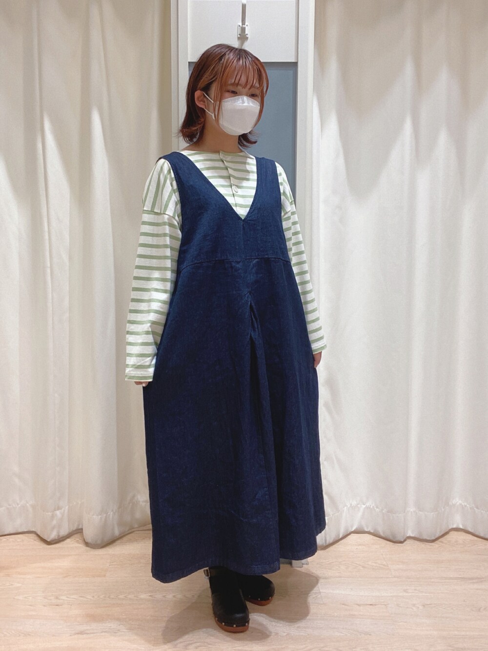こんにちは ミ イ です🐶 ご覧いただきありがとうございます! ジャンスカ着回しコーデその2✨ ボーダーTと合わせてカジュアルコーデです! ジャンスカは着丈の長さ調整可能◎ Aラインのシルエットが楽で着やすいです! 是非 お近くの店舗でご覧下さい☺️💜