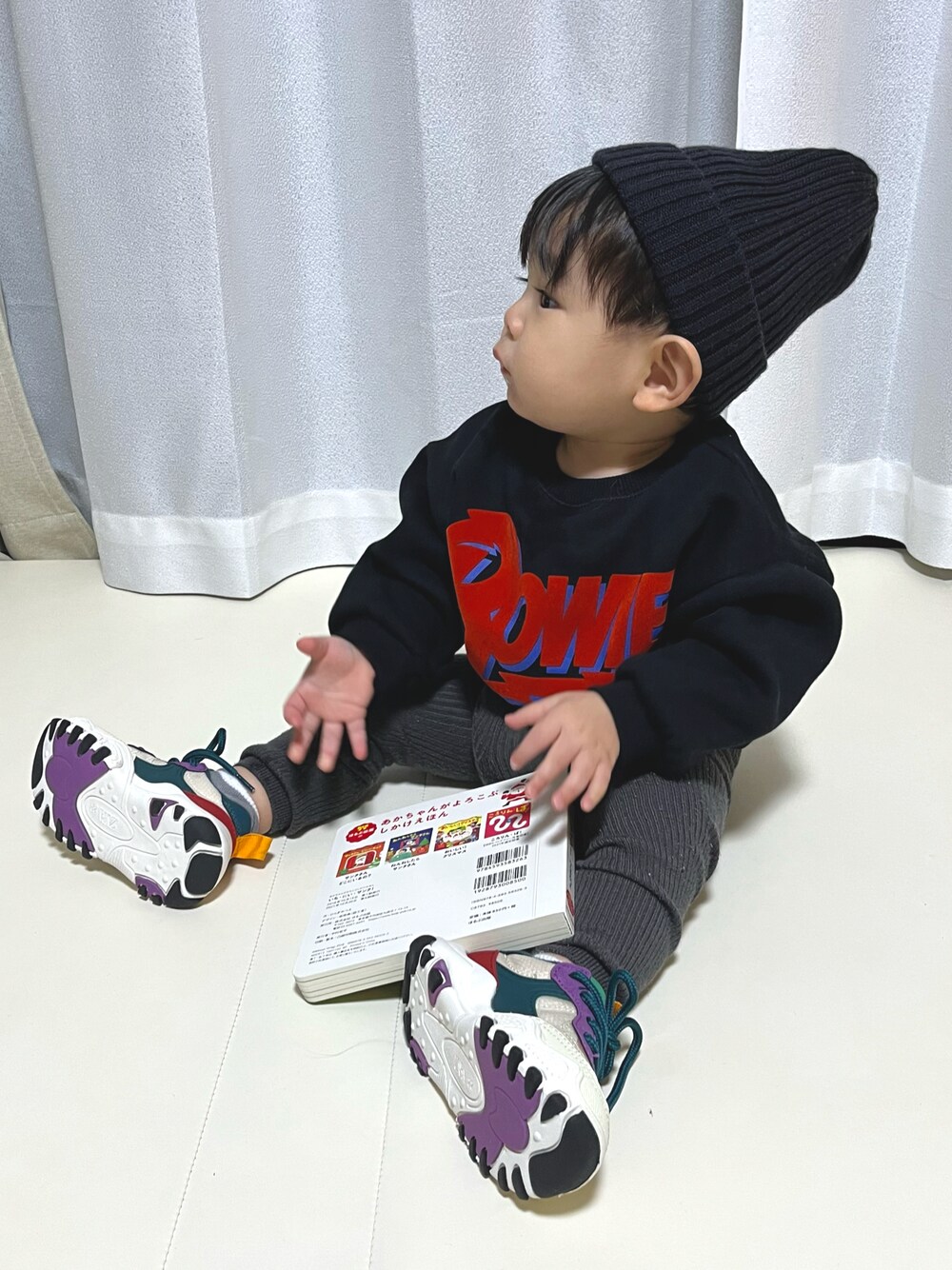 スニーカーが可愛すぎて一目惚れ🫢 まだよちよち歩きなので、 少し大きめサイズ(14cm)を納入しました。 スウェットのダボっと感が好きです🫣 baby boy 11month 9.5kg