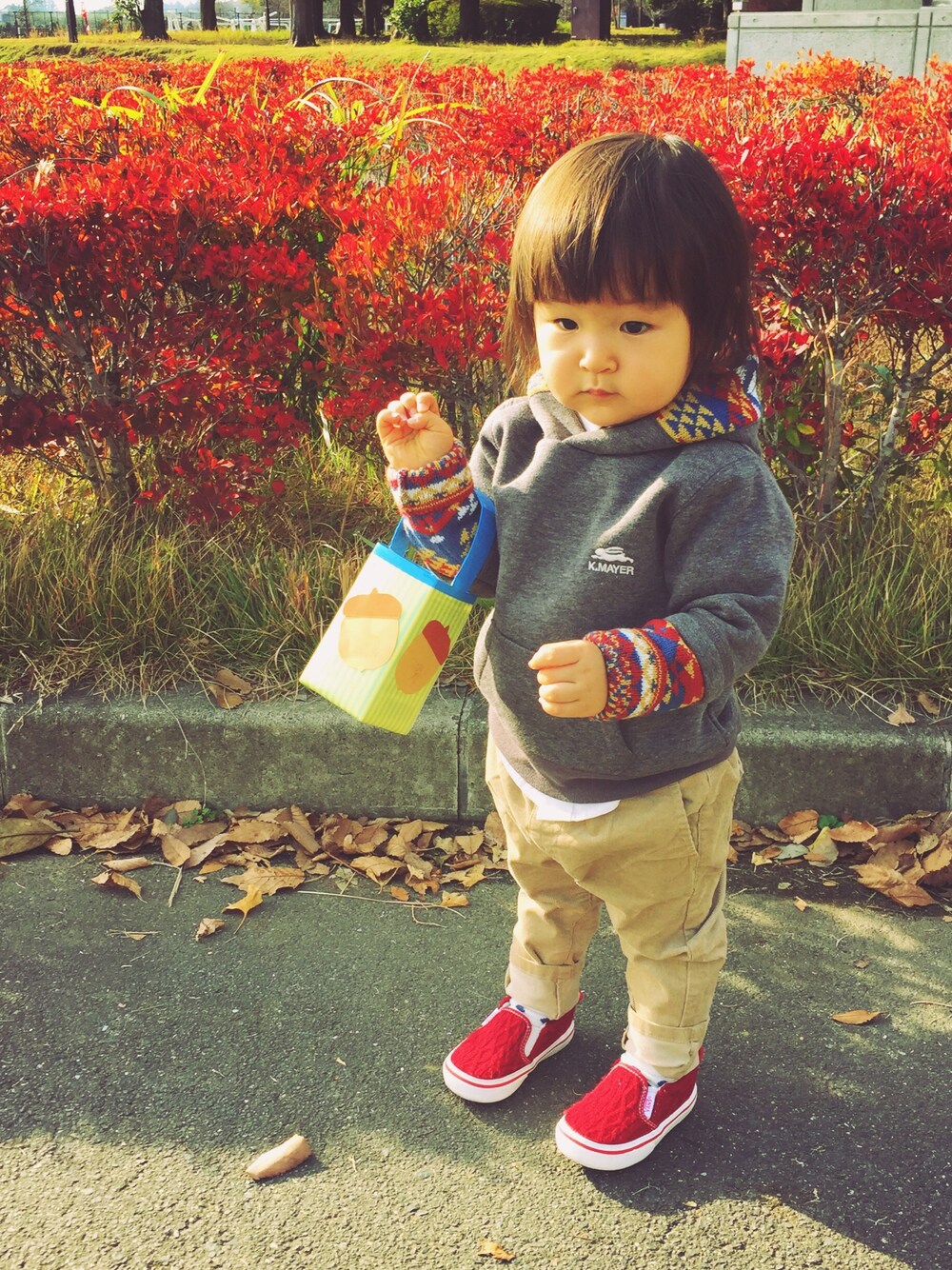 今日もパーカーフェスタ2015に参加させていただきます☆★☆ よろしくお願いします◟̆◞̆୨୧˖ 大きめのパーカーを買ったつもりが袖が少し長いくらい…あれ?息子くん意外と大きい?笑 この袖とフードの柄が気に入って一目惚れでした♡ 息子くんと母ちゃんで作ったどんぐりバックを持って、どんぐり拾いに行ってきました🌰 雨が降る前にーーー💦と急いで(笑) とっても張り切って、どんぐりバックを離そうとしない息子くんです◟̽◞̽ 笑