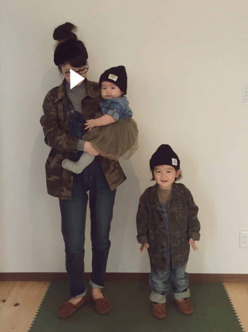 いつもありがとうございます♡ 親子3人でリンクです◡̈⃝ ▷ミリタリージャケット ▶︎オーバーオール ▷minnetonka 娘さんはデニムとカーキでゆるリンク○